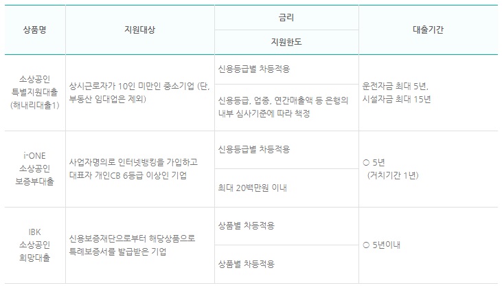 | 성장촉진자금 | (직접대출) 업력 3년 이상이며 자동화설비 도입하여 운영중이거나 도입하고자 하는 소상인 |