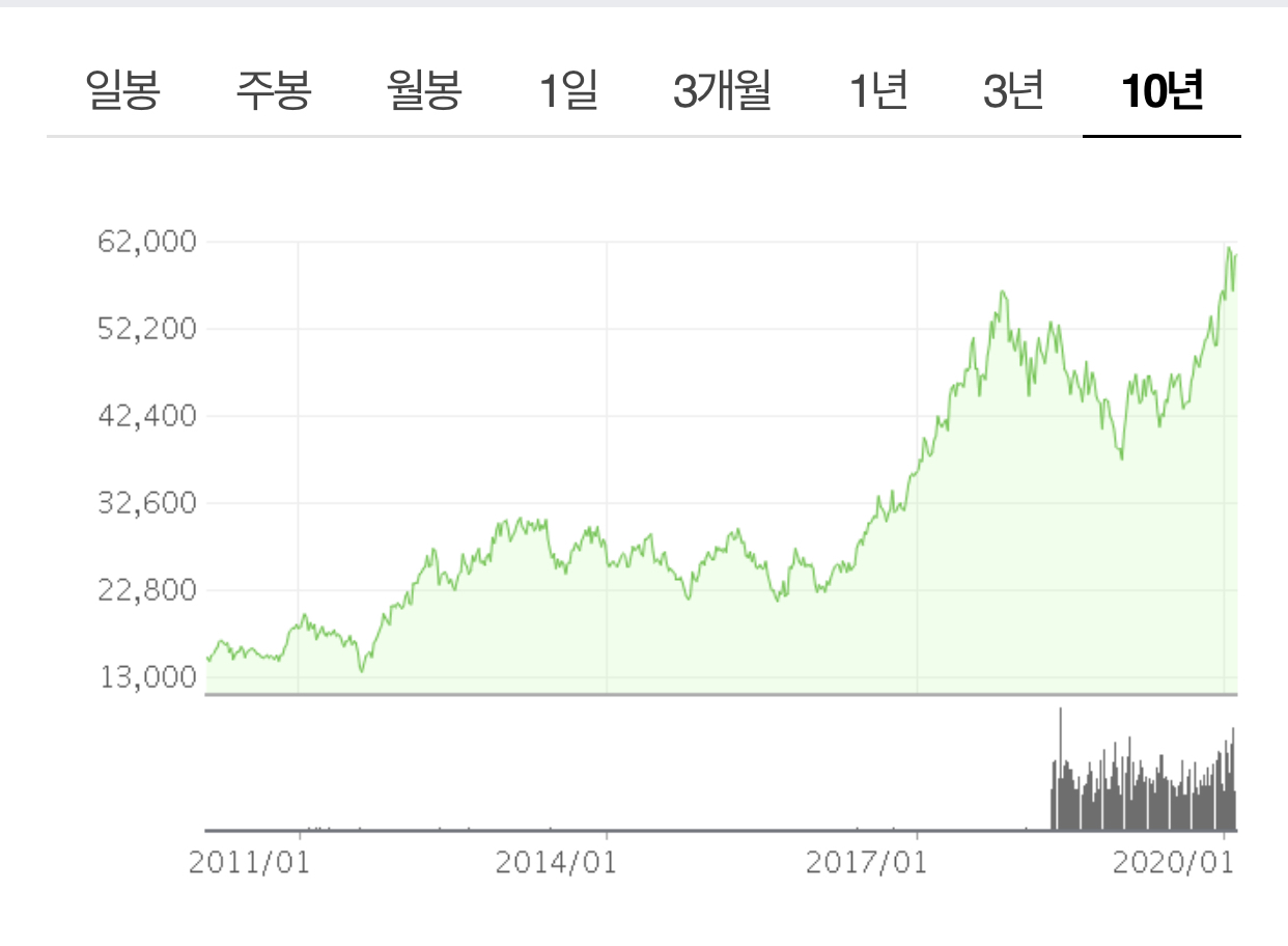 지난 10년의 그래프를 보면 오르락 내리락하지만 1만 원대 주식이 현재는 6만 원대 주식이 되어있다.