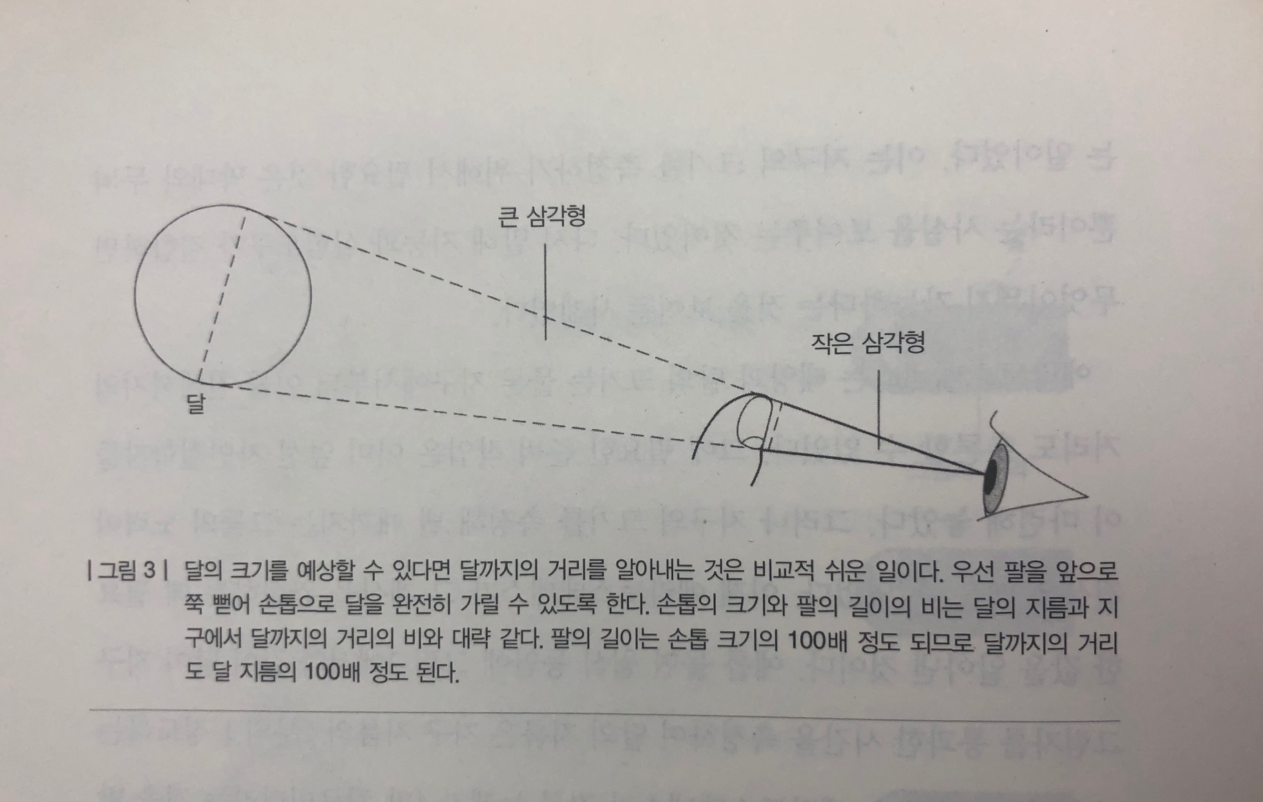 팔의 길이와 손톱 크기의 비율인 100:1은 달까지 거리와 달의 지름의 비를 나타내기 때문에 달까지의 거리는 달 지름의 약 100배가 되어 32만 킬로미터라는 것 또한 알아낼 수 있었다.
