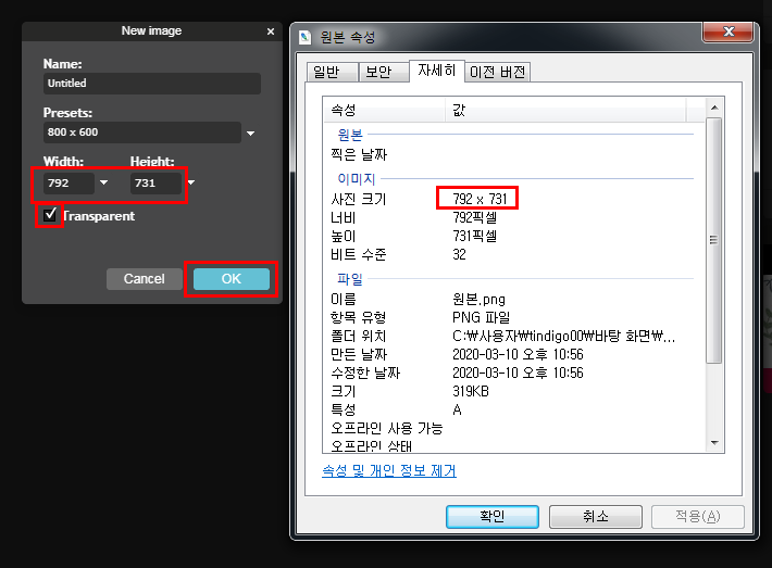 이후 원본 이미지 크기와 동일하게 생성한다. 생성하기 전에 꼭 teansparent(투명도)를 체크하길 바란다.