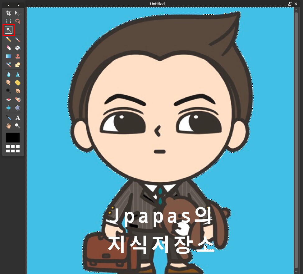 ▲왼쪽의 도구 목록에서 위에서 세 번째에 위치한 마법봉을 누르고, 원하는 배경을 선택해서 delete 키를 누르면 오른쪽 이미지와 같이 원하는 이미지를 두고 배경을 삭제할 수 있다. 캐릭터들은 곡선이 많아, 깔끔하게 지워지진 않는다.