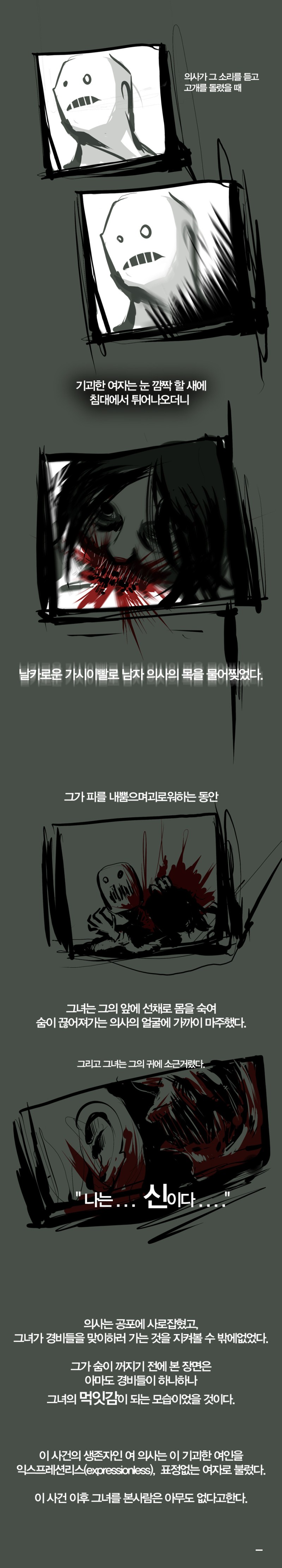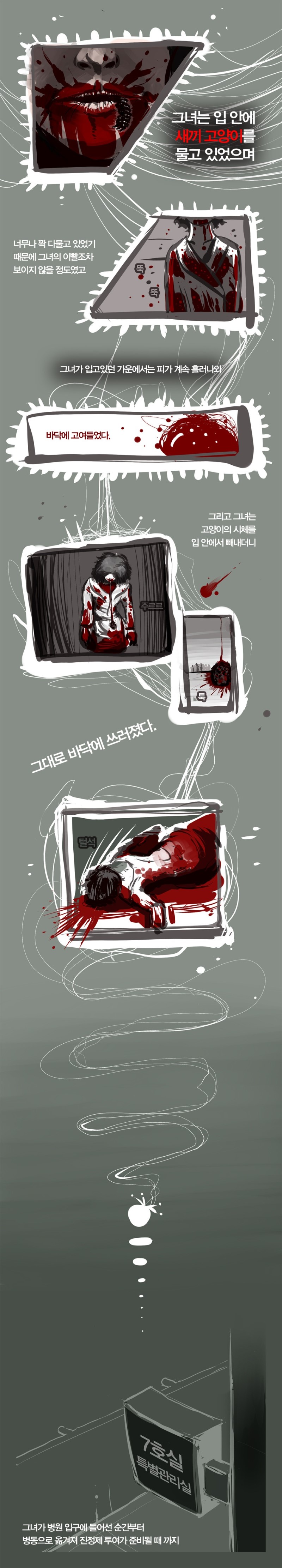 라고 묻자 여자는 표정을 바꾸지 않고 입 안에서 새끼 고양이 살점을 집어던지며 그대로 쓰러졌다.