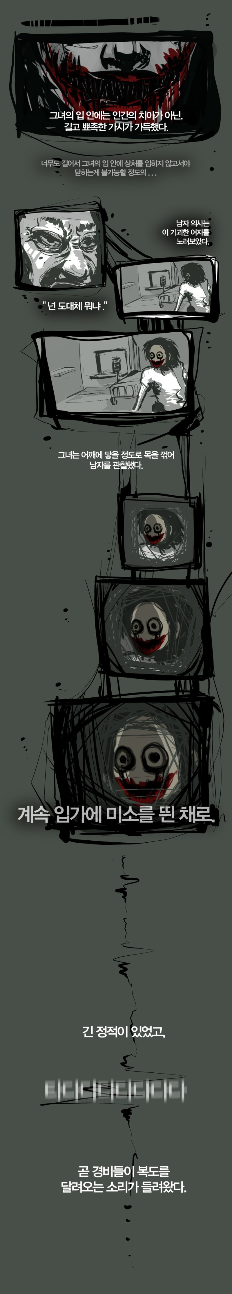 그리고, 그녀의 웃는 입 사이로 치아가 보였는데 입을 꼭 다물면 상처가 날 것처럼 너무도 길고 뾰족했던 것이다.
