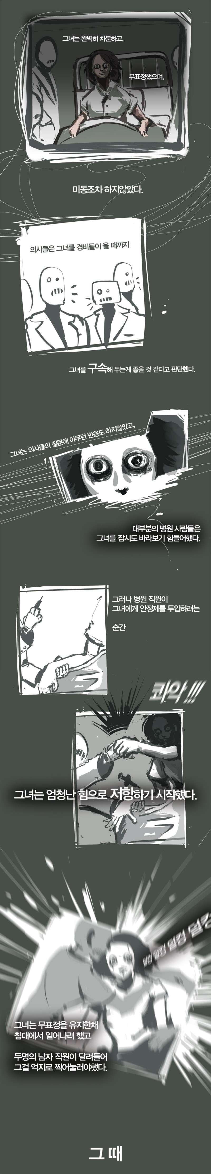 여자는 무표정한 채 무서운 힘으로 날뛰기 시작했다.
