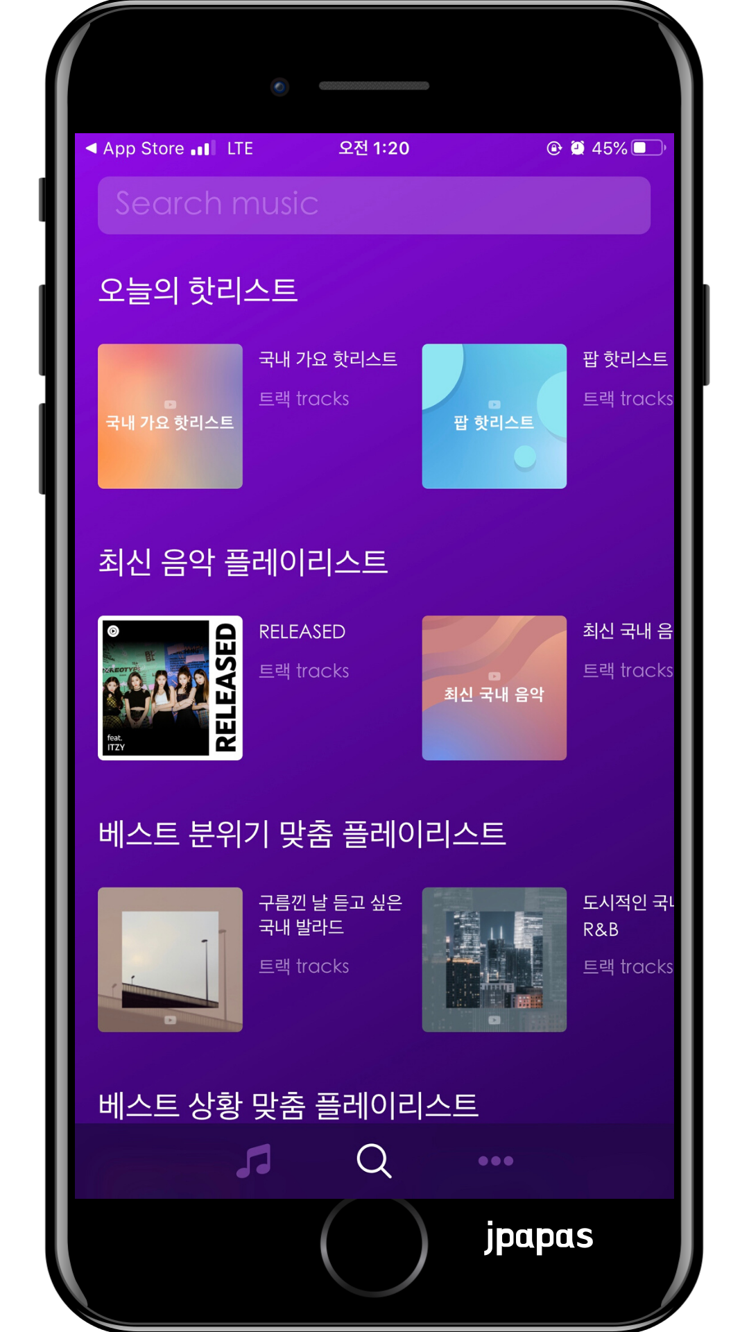 바로 밑으로 내리면 오늘의 핫 리스트, 최신 음악 플레이리스트. 베스트 분위기 맞춤 플레이리스트가 눈에 들어온다.