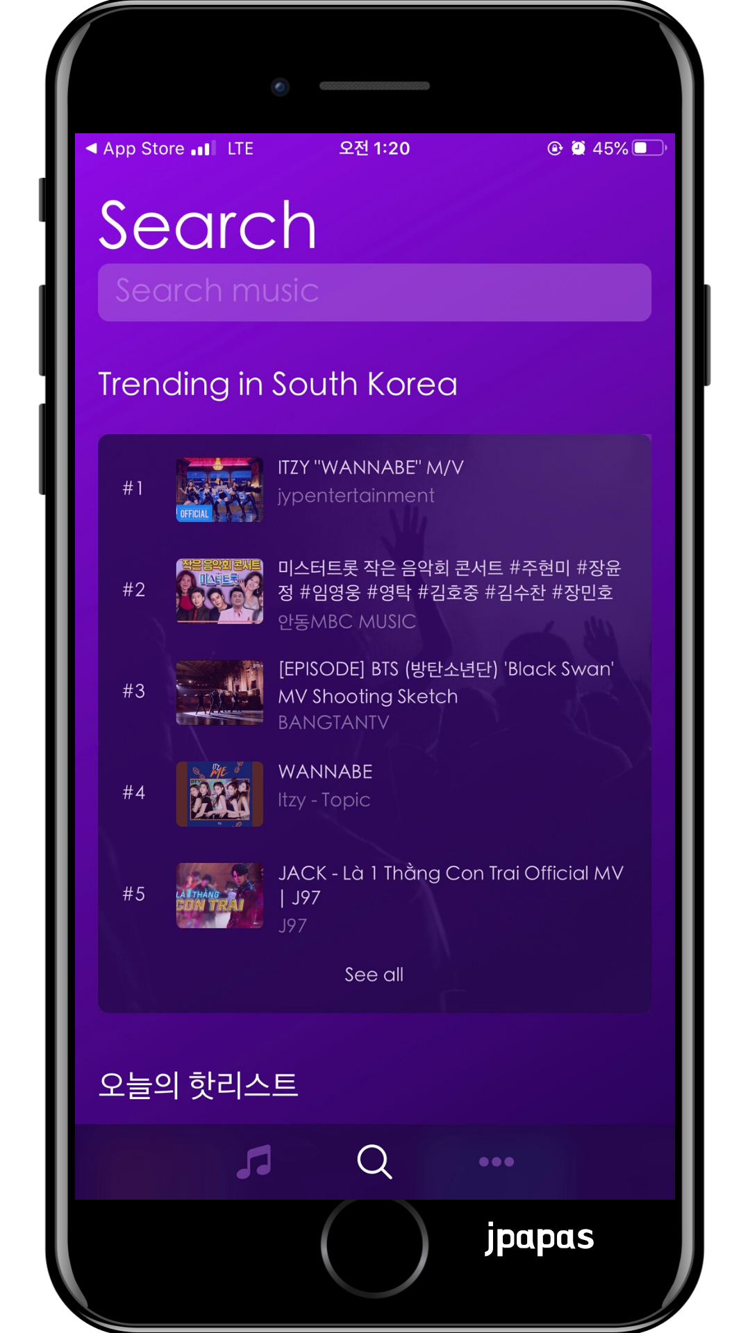 서치 화면으로 들어왔을 때 현재 음악 순위가 바로 보인다. ITZY의 WANNABE 가 1위로 있다.