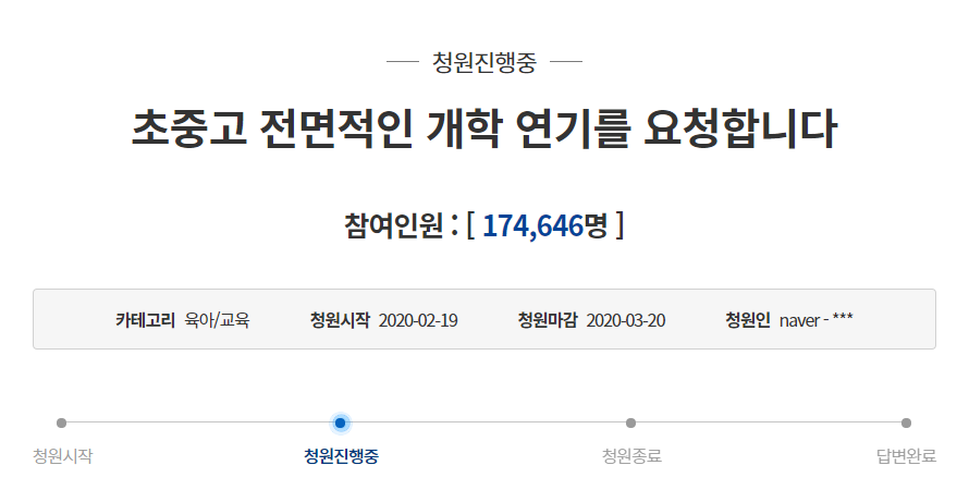 현재 위와 같이 청원이 올라온 상황이다. 또 마스크 5부제 시스템 때문에 마스크 5부제는 일주일에 두 번밖에 구매할 수 없는 상황이라 일주일에 두 개의 마스크를 쓰고 학교에 갈 수 있는지의 문제도 있고, 이 두 개를 항상 살 수 있다는 보장도 없기 때문에 더욱 불안한 상황이다. 그리고 학생들과 아이들이 뛰어다니기를 좋아하고 노는 것을 좋아하기 때문에, 자녀들은 항상 마스크를 쓰지 않을 수도 있는데, 이것은 감염에 노출되는 데 매우 위험하다.