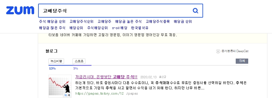 실제로 zum 사이트에 고배당 주식이라는 키워드로 검색을 하면, 최상단에 필자의 블로그가 보인다.