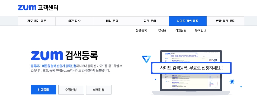 사이트 가장 하단에 고객센터라는 글자를 클릭하면 사이트 검색 등록을 할수 있다.