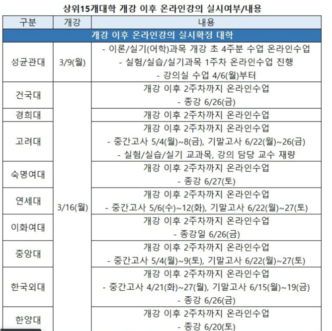 고려대, 국민대, 서울대, 연세대, 중앙대, 서울시립대, 한국외대, 경희대, 건국대, 인천대, 세종대 등이 온라인 강의를 진행 중이다.