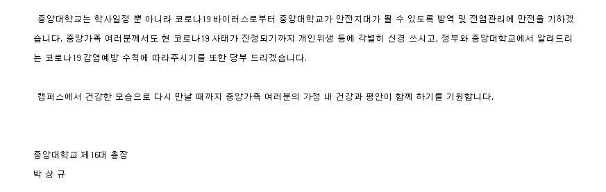 중앙대학교는 학사일정뿐 아니라 코로나 19 바이러스로부터 중앙대학교가 안전지대가 될 수 있도록 방역 및 전염관리에 만전을 기하겠습니다. 중앙가족 여러분께서도 현 코로나19 사태가 진정되기까지 개인위생 등에 각별히 신경 쓰시고, 정부와 중앙대학교에서 알려드리는 코로나19 감염예방 수칙에 따라주시기를 또한 당부드리겠습니다.