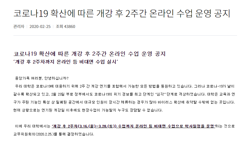 우리 대학은 코로나 19에 대응하기 위해 2주 간 개강 연기를 포함해서 가능한 모든 방법을 동원하고 있습니다. 그러나 코로나-19가 날이 갈수록 확산되고 있고, 2월 23일 부로 정부에서도 코로나 19의 위기 경보를 최고 단계인 “심각” 단계로 격상하였습니다. 대학은 교육과 연구가 주된 기능인 특성상 밀폐된 공간에서 대규모 인원이 장시간 체류하는 경우가 많아 바이러스 확산에 취약할 수밖에 없는 곳입니다. 현재 상황으로는 연기된 개강일 이후에도 현장수업이 가능할지 누구도 장담할 수 없습니다.