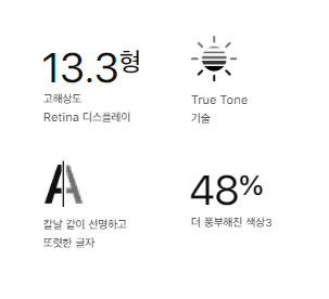 이번에 공개된 맥북 에어 2020은 매우 얇고 가볍기까지 해서 기존의 출시된 맥북 에어 제품보다, 그 어느 때보다 더 탐나는 제품임이 분명하다. 선명한 레티나 디스플레이를 탑재해 그 어느때보다 맥북 에어 2020은 매우 선명한 것을 특징으로 내세웠다. 2560 x 1600 해상도와 400만 개가 넘는 픽셀로 선명함을 보여주고 있으며, True Tone 기술로 인해 주변 환경의 색 온도에 맞춰 화이트 포인트를 자동으로 조절해주어 웹페이지와 이메일이 마치 인쇄된 것과 같이 매우 자연스럽게 보이는 제품이다.