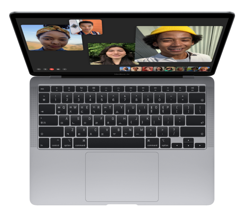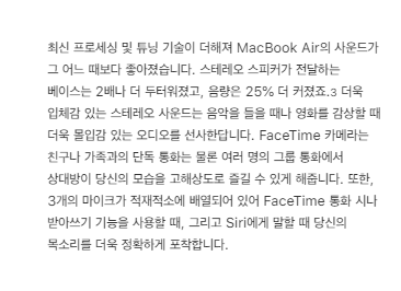맥북 에어 2020의 스피커는 음량이 최대 25%까지 더 커진 음량을 제공하며, 3개의 마이크 배열로 음석을 더욱 정확하게 잡아낸다. 스테레오 스피커가 전달하는 베이스는 2배로 증가되었으며, 입체감 있는 스테레오 사운드를 통해 음악을 감상하거나, 아니면 영화를 감상할 때 더욱 몰입감을 높게 만들어 준다. 이번 맥북 에어 2020은 그 어느 때보다, 사운드가 더욱 향상되어, 생생한 음질로 감상을 할 수 있을 것이다. 그 외로 FaceTime 카메라를 통해 친구 또는 가족과의 통화에서는 물론, 그룹 통화를 할 때에도 상대방을 현실감 있게, 높은 고화질의 해상도로 만날 수 있게 되었다.
