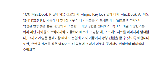 맥북 에어를 접하지 않았거나, 구매할 예정이라면, 출시된 맥북 에어 2020은 최고의 선택이라 할 수 있겠다. 많은 부분이 업그레이드되었고, 간편하게, 작업을 할 때 편한 맥북 에어 2020을 강추한다. 현재는 구매 불가능하고, 사양만 자세히 설명되어있다. 조만간 구매 가능하게 제품을 판매할 예정이라고 하니 미리 알아두고, 결정함에 있어 도움이 되었으면 좋겠다.