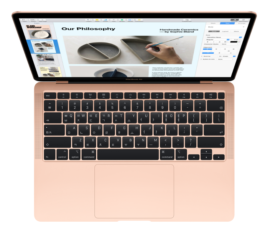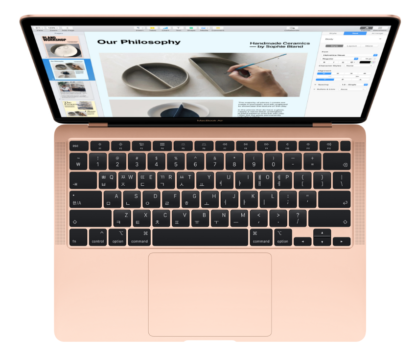16형 MacBook Pro에 처음 선보였던 새 Magic Keyboard가 이제 맥북 에어 2020에도 탑재되었다. 세상에서 가장 우수한 트랙패드 중 하나인 Force Touch 트랙패드. 새롭게 디자인된 가위식 메커니즘은 키 트래블이 1 mm로 최적화되어 탁월한 반응성과 함께, 마치 손가락이 주인공인 무대처럼 편안하고 조용한 타이핑을 경험할수 있다. 또한, 역 T자 배열의 방향키는 여러 라인 사이를 빠르게 이동하며 코딩 작업이나 다양한 작업을 할 때, 스프레드시트를 이리저리 탐색할 때, 그리고 게임을 플레이할 때에도 이동이나 방향 전환이 수월하게 할 수 있도록 적용되었다. 그리고 맥북 에어 2020의 마지막으로 주변광 센서를 갖춘 백라이트 키 덕분에 조명이 어둡더라도 항상 안전하게, 빛나고 있어, 타이핑이 수월하다.