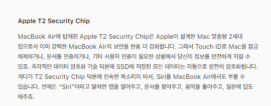 Touch ID의 향상된 보안 성능을 이제는 맥북 프로 2020에서도 누릴 수 있다. Touch ID 센서에 손가락만 올려놓으면 맥북 프로 2020을 바로 잠금 해제할수 있다. 잠긴 문서, 메모, 시스템 설정 등에서도 매번 암호를 입력하는 번거로움 없이 손가락만 대면 즉시 열린다. 또한 맥북 프로 2020에서도 T2 Security Chip 덕분에 친숙한 목소리의 비서, Siri를 맥북 에어 2020에서도 부를 수 있게 되었다. 매우 간편한 우리의 비서 Siri , 언제든 “Siri"야라고 말하면 앱도 열어주고, 문서도 찾아줄 뿐만 아니라, mp3도 말만 하면 실행해주고, 궁금한 것에 대한 질문도 답을 해주게 되었다.