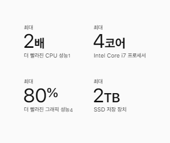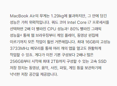 맥북 에어 2020의 무게는 1.29kg에 불과하며, 성능은 가히 위력적이다. 그래픽의 성능은 최대 80% 향상된 기능을 제공한다. 또한, 쿼드 코어 Intel Core I7 프로세서의 제품은 CPU 성능이 2배나 빨라진 모습을 보여주고 있다.