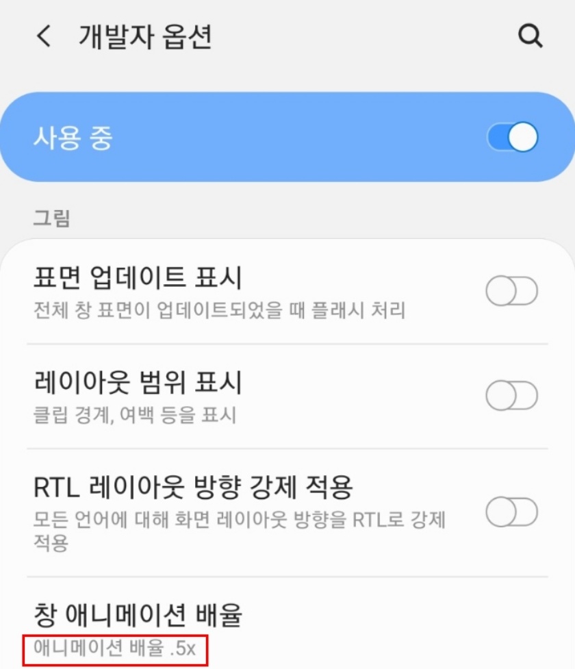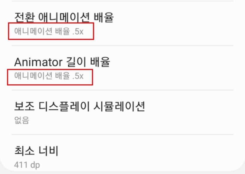 6. 밑으로 쭉 내리면 창 애니메이션 배율, 전환 애니메이션 배율,