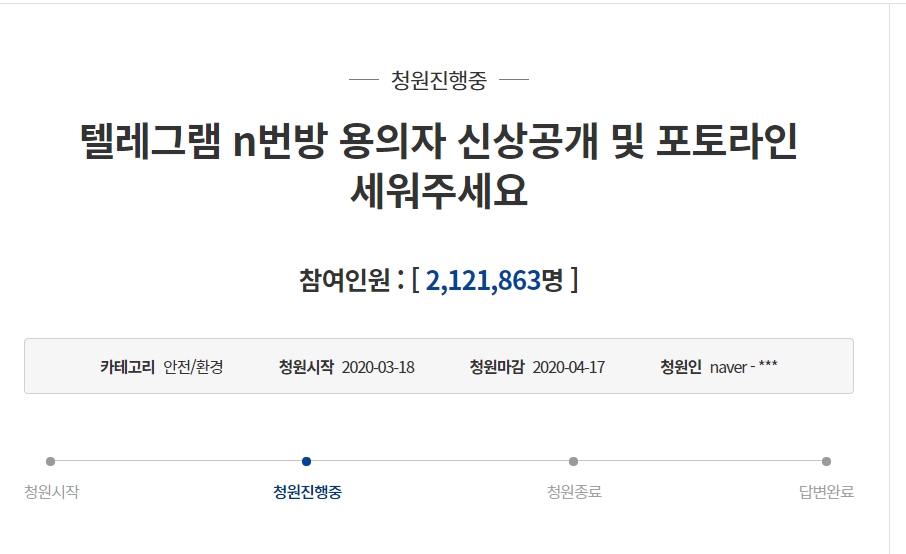 한편 청와대 헌법소원위원회는 22일 텔레그램 N번방의 피의자의 신상공개와 포토라인 설치를 위한 200만 명 이상의 동의를 받았다. 청와대 공개 청원서가 만들어진 이후 청원자가 200만 명을 넘어선 것은 이번이 처음이다.