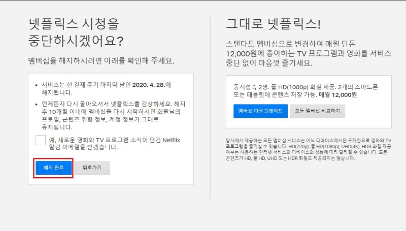 위의 스크린샷을 본 것처럼 넷플릭스 해지 방법은 매우 간단하다. 어떤 서비스는 해지를 하지 못하게 잘 찾기도 힘들게 꽁꽁 숨겨둬서 마치 숨바꼭질을 하듯 해지 버튼을 찾아야 하는데, 넷플릭스 해지하는 방법은 누워서 떡먹기처럼 매우 간단하다. 넷플릭스는 이렇게 상당히 당당하게 해지 버튼을 숨기지 않고 드러내고 있다. 그리고, 만약 해지가 끝나기 이전에 다시 해지 신청한 것을 취소하고 싶다면, 멤버십 재시작을 통해 다시 정상적으로 서비스를 이용할 수 있게 변경이 가능하다는 점 잊지 말자!