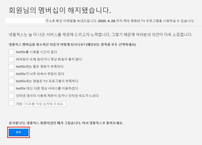넷플릭스 해지하는 과정에서 내용을 보면, 회원 정보를 10개월간 보관한다고 적혀있다. 만약 해지 후 10개월이 지났다면? 그 이후, 해지 이메일을 다시 입력해서 등록을 하면, 다시 무료 30일이 이용 가능하다. 이번에, 포스팅을 위해 예전에 가입했었던 10개월이 지난 평소 사용하지 않는 아이디로 가입을 해서 작성을 해보았는데, 사용해보지도 못하는 아이디가 아깝다.