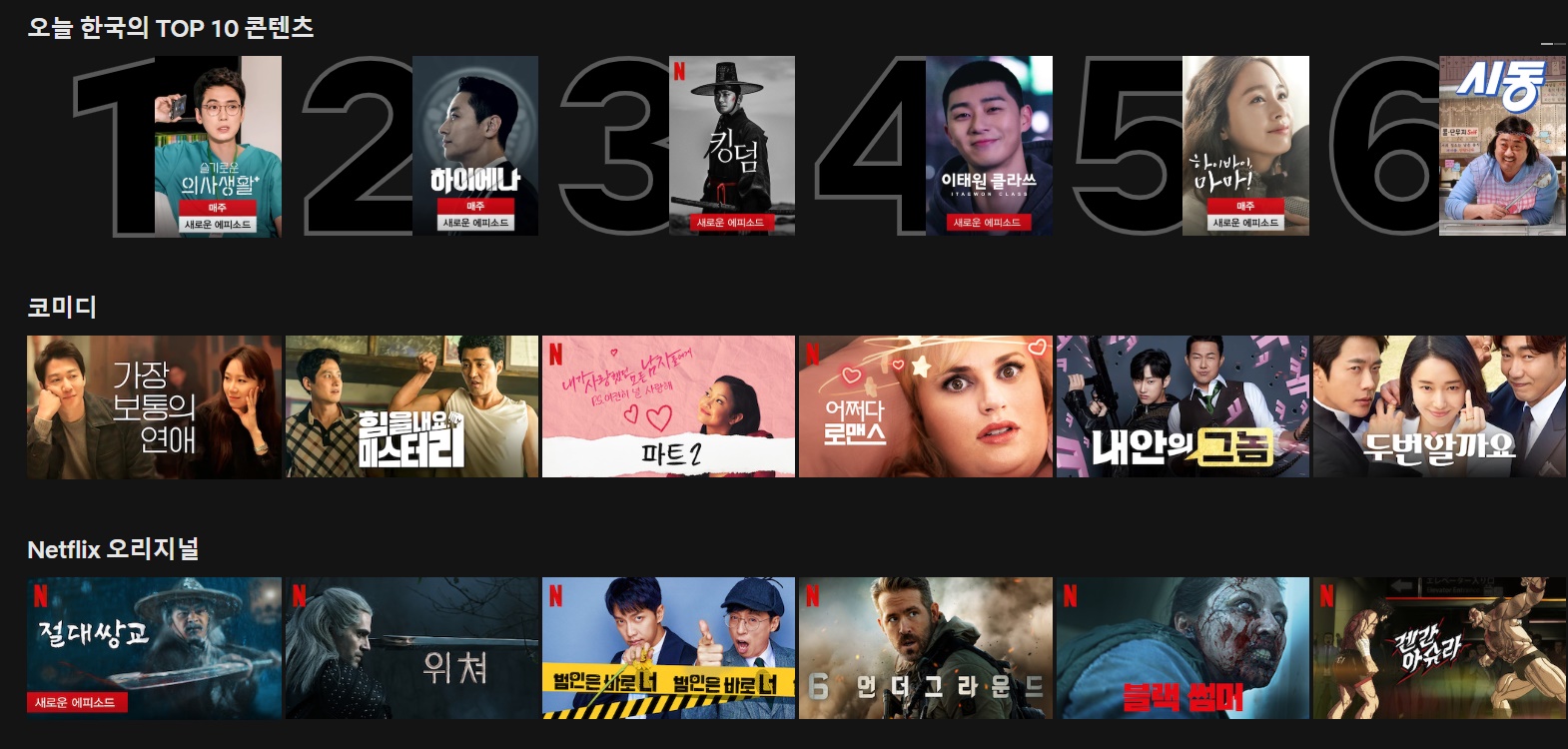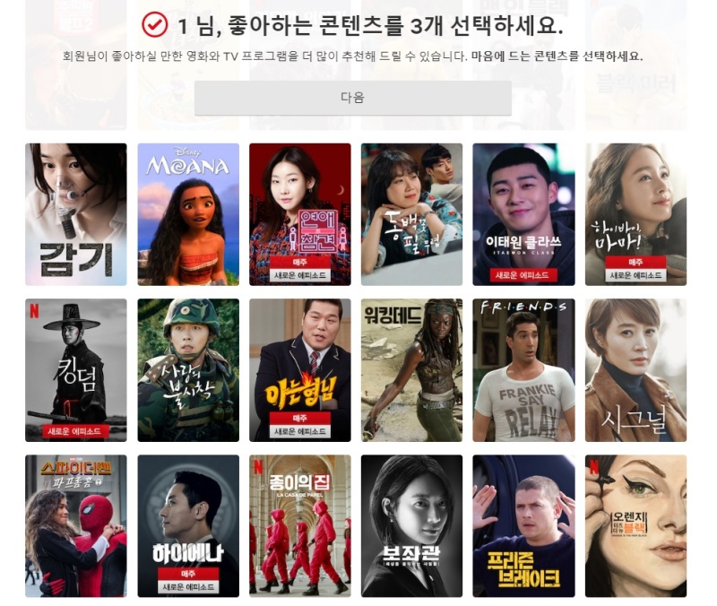 좋아하는 콘텐츠를 3개 선택하라고 나오는데, 취향에 맞는 영상 3개를 클릭하면, 자동으로 선택한 영상과 어울리는 영상만을 선택해서 화면에 보여준다. 그리고 오래 오래 사용할수록 본인의 취향과 딱 맞는 영상을 선별해주기 때문에 넷플릭스의 매우 강한 장점이라고 생각한다. 본인은 킹덤을 제일 먼저 선택했는데, 메인 이미지가 너무 무섭고, 잔인해 보이는 이미지라서, 포스팅하는 스크린샷은 킹덤의 사진을 사용하지 못했다. 이런..