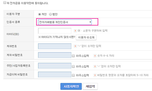 위의 동의항목을 모두 체크한 다음 하단에 개인/법인 선택을 하고 인증서 종류에서 전자거래범용 을 선택해 줍니다. 나머지는 해당 은행에서 개설한 통장 정보를 입력해 주시면 됩니다.
