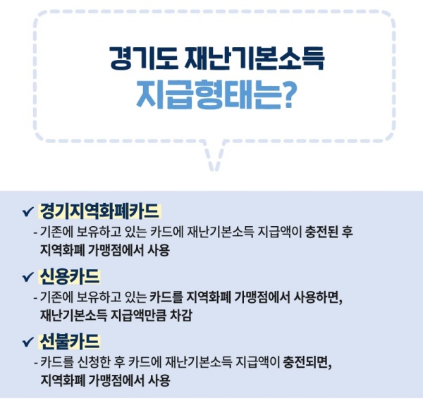 ②신용카드 신청자 : 경기도 재난기본소득 홈페이지에서 카드사와 카드번호 등을 입력하면 신청자 인적 정보 및 신청금액 확인을 거쳐 접수. 하나, 우리, 국민, 신한, 삼성, 비씨, 롯데, 수협, 농협, 기업, 한국씨티, SC제일, 현대 등 13개 카드사의 카드를 이용가능하며, 단, 체크카드는 사용 불가하다. 신청 이후 3~5일 이내에 카드사로부터 사용 가능 문자를 받으면 사용할 수 있다.