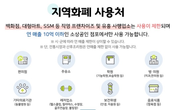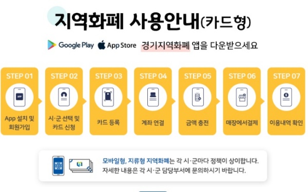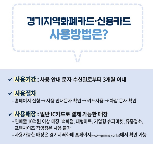 지급 방법 경기지역화폐카드는 10만 원 충전 신용카드는 사용액에서 자동차감 청구 사용 매장 연매출 10억원 이하 매장에서 사용가능하다. (경기지역화폐카드+신용카드+선불카드)