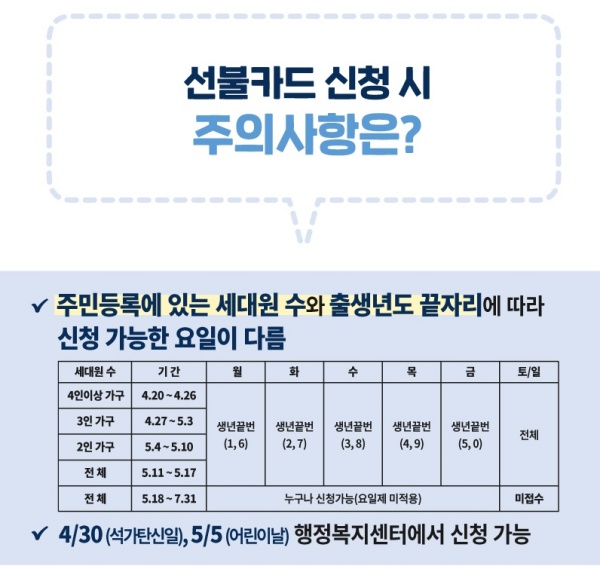 ※선불카드는 가족구성원이 대리신청 및 수령이 가능하며 교통약자 등 취약계층과 사회복지시설 등을 위해 5월 중순부터 찾아가는 현장 발급 서비스를 실시할 예정이다.