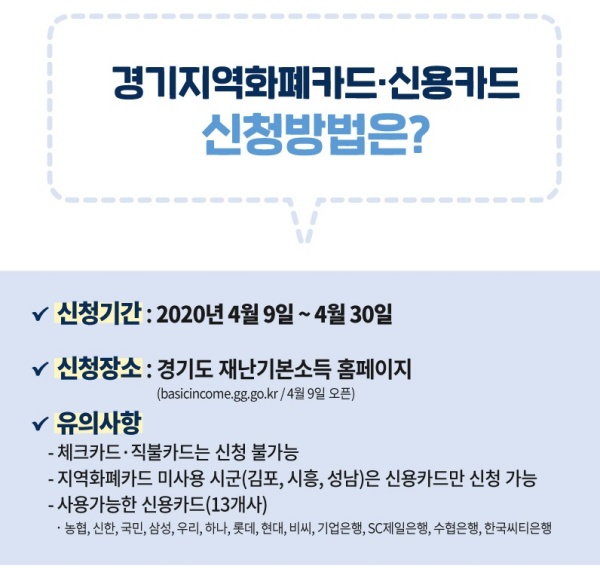 (기간) 4. 9 ~ 4. 30 (방법) 경기도 재난기본소득 홈페이지에서 경기지역화폐카드와 신용카드 사용 온라인 신청 카드번호 입력 및 핸드폰 본인 인증 주민등록을 기준으로 동일 세대원인 미성년 직계비속에 한하여 대리 신청이 가능하다. 또한, 사용 기간 카드사 사용가능 문자 수신일 부터 3개월 이내 사용가능하며, 3개월이 경과하면 재난기본소득으로 차감되지 않는다. 기간내에 사용되지 않은 잔여금액은 미사용으로 회수된다. 반드시 기간내에 사용할것을 바란다.