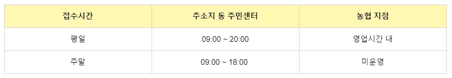 주소지의 행정복지센터 또는 농협은행을 방문해 신청할 수 있으며. 방문 시에는 반드시 신분증을 지참해야 한다. 대리신청은 배우자 및 직계존비속에 한하며 위임은 사전에 구두로 받고 신청서 위임란에 확인하면 된다. 만약 위임 받지 않고 신청서를 허위신청할 경우 형사 처벌 될 수도 있다는 점은 반드시 기억해두길 바란다.