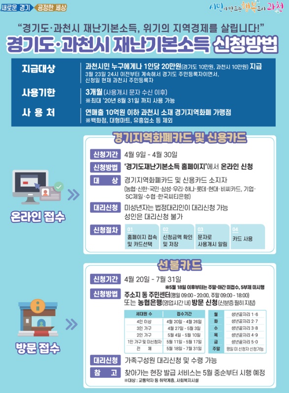 2020년 3월 23일 24시 이전부터 계속해서 주민등록이 되어 있는 경기도민이면서, 신청일 현재 과천시에 주소지를 둔 과천시민은 과천시가 지급하는 재난기본소득 10만원과 경기도가 지급하는 10만원을 합쳐 총 20만원의 재난기본소득을 받게 된다.