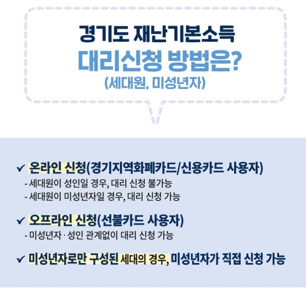 홈페이지를 이용한 온라인 신청은 주민등록을 기준으로 동일 세대원인 직계존비속 미성년자에 한해 대리 신청이 가능하며, 성인의 경우 대리 신청이 불가하다.
