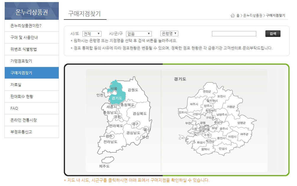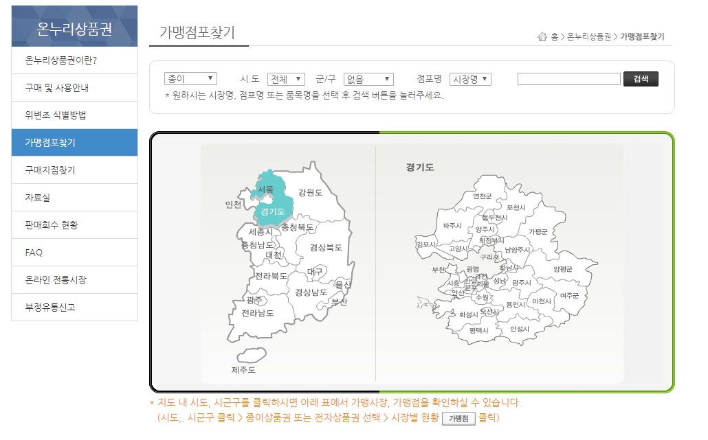 가맹점포찾기를 보면 시도, 군구 등을 글자로 지정해서 찾을 수도 있으며, 아래 지도를 직접 클릭해 사용처를 찾을 수도 있다. 지도가 플래시라서 최근 웹브라우저에서는 안 보일수도 있으니 당황하지 말길 바란다.