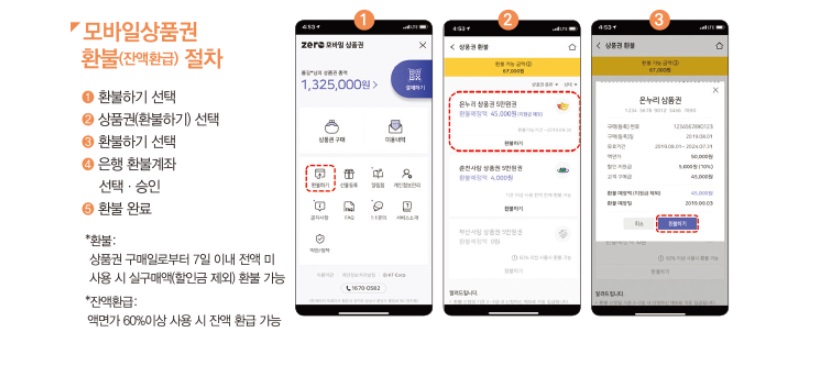 ■권면금액(총 구매금액)의 60% 이상 구매할 경우 잔액을 현금으로 돌려받을 수 있습니다.