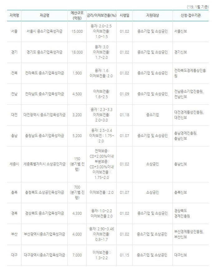 지자체별로 예산규모가 다르고 금리와 이차보전율 또한 다르니 본인의 사업 및 거주지역에 맞춰 알아보길 바란다.