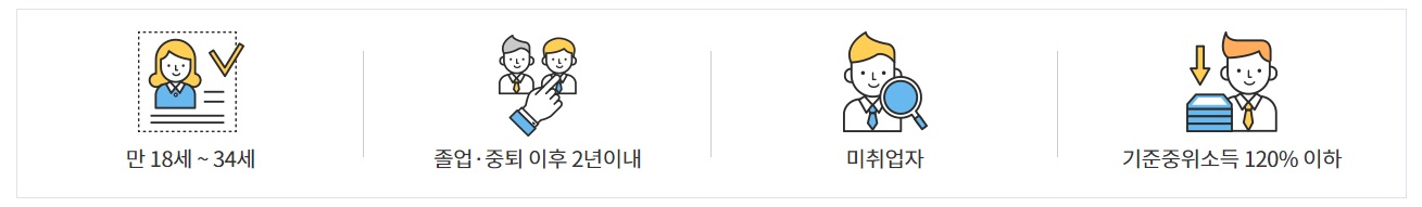 지원대상은 만 18~34세 미취업자 중 △고교·대학(원) 졸업 또는 중퇴 2년 이내고 만 18세~34세로 제한을 두고 있으며 △중위소득 120%(4인가구 기준 월 569만9000원) 이하 가구원으로, △미취업(단 , 주 근로 시간 20시간 이하인 경우 미취업으로 간주) 상태인 청년들이 신청가능하며, 선정된 청년들에게는 6개월간 월 50만원이 지원된다.