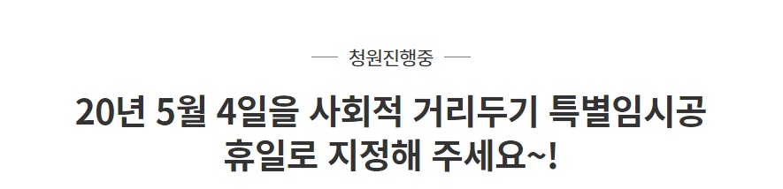하지만 그래도 좋은 소식이 있다. 좋은 소식과 함께 더불어 현재 5월 4일을 사회적거리두기 특별 임시공휴일로 정하자는 의견이 청원으로 올라와 있다. 청원에 참여하고자 하는 분들은 아래 링크를 통해 청원을 하면 되겠다. 하지만 개인적인 생각으론 불가능에 가깝지 않나 생각이 든다. 하지만, 임시공휴일을 원하시는분 또한, 많을것으로 예상된다.