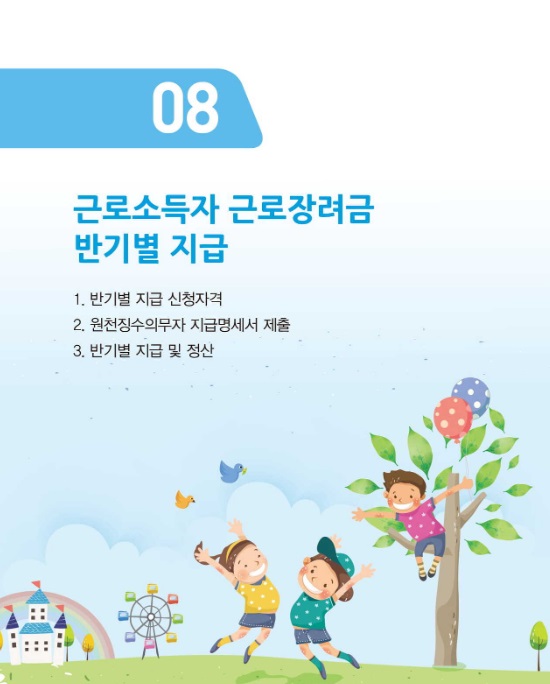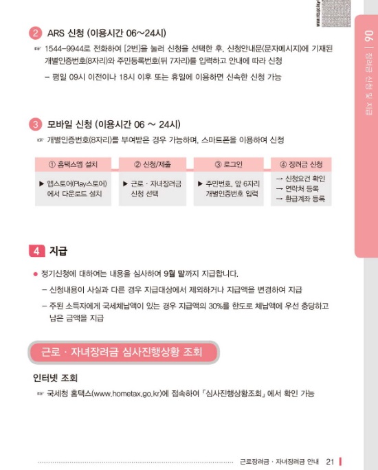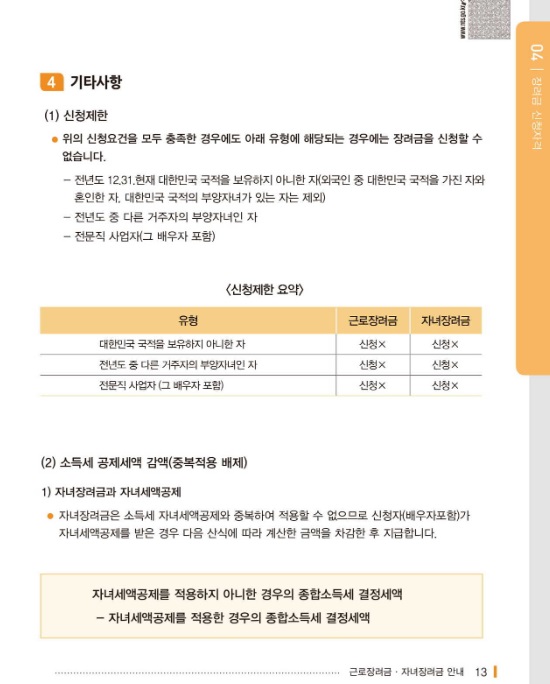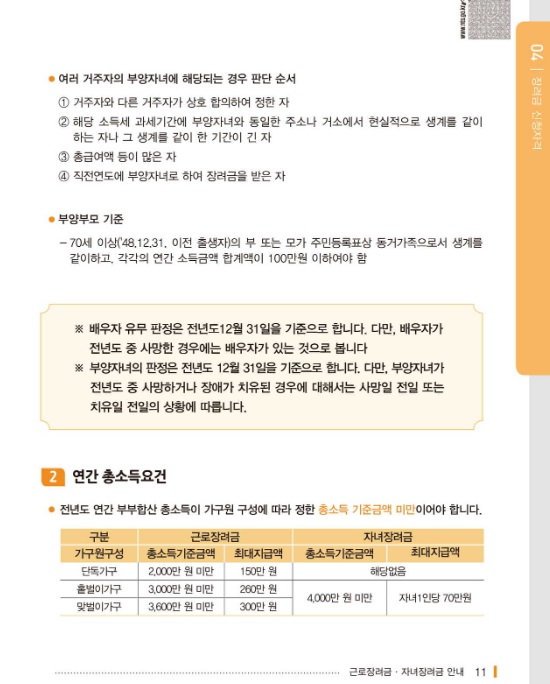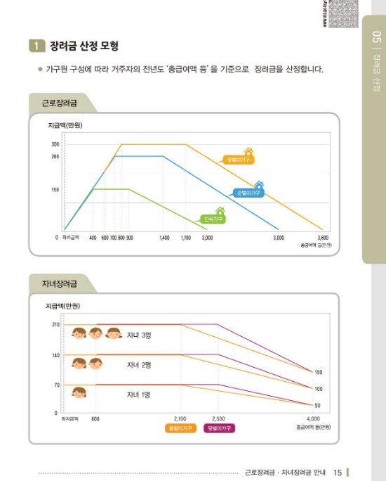 자녀·근로장려금은 가구별로 지급하므로, 1가구에서 1명만 신청하고 지급받을 수 있다. 배우자·부양가족 유무에 따라 단독·홑벌이·맞벌이 가구로 분류된다.