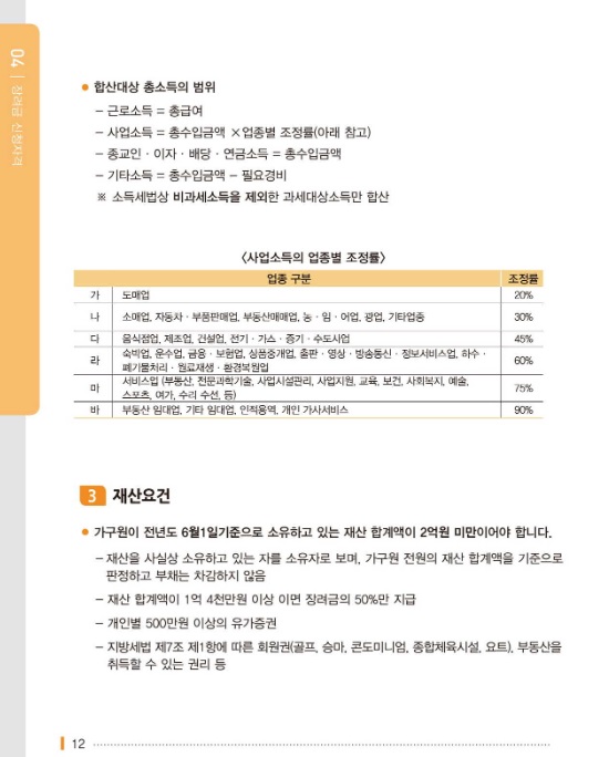단독가구는 배우자와 부양자녀, 70세 이상 직계존속이 없는 가구이며 홑벌이가구는 배우자(총급여액 등이 3백만 원 미만)나 부양자녀, 또는 70세 이상 직계 존속이 있는 가구다. 맞벌이가구는 신청인과 배우자의 각각의 총급여액 등이 3백만 원 이상인 가구다.
