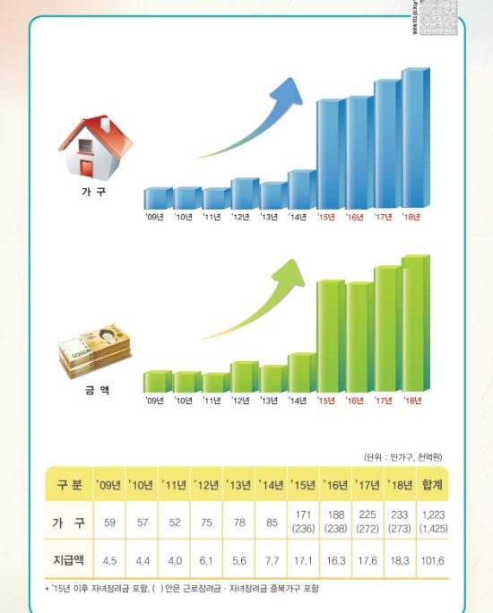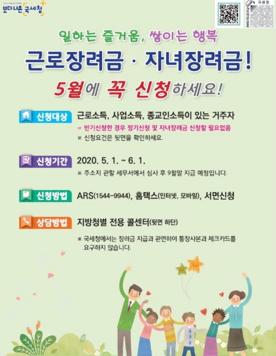 국세청은 일하는 저소득 가구에게 지원하는 근로 자녀 장려금을 신청하라는 안내문을 발송했다고 27일 밝혔다. 정부가 밝힌 지급금액은 저소득 가구에 근로 장려금을 최대 300만원씩, 자녀장려금을 자녀 1인당 70만원씩 지급한다고 밝혔다.