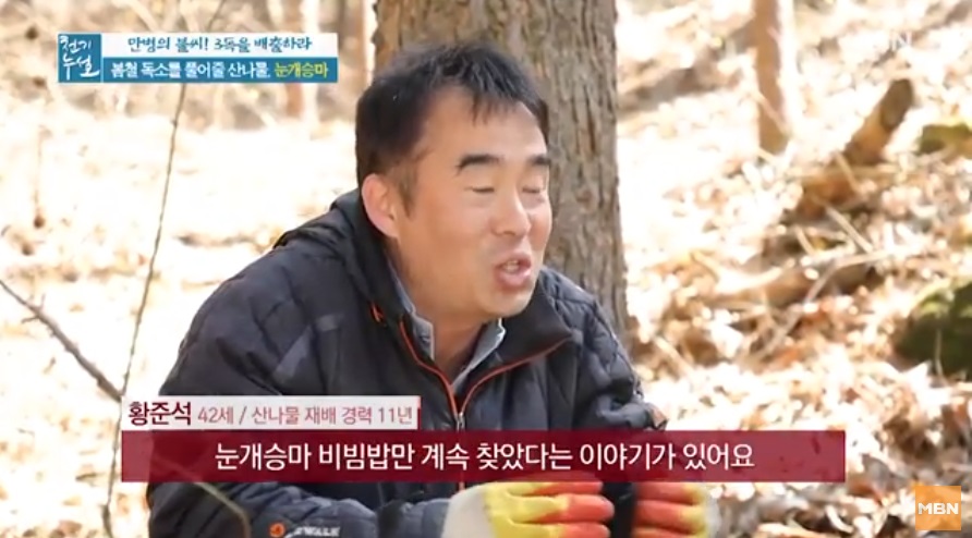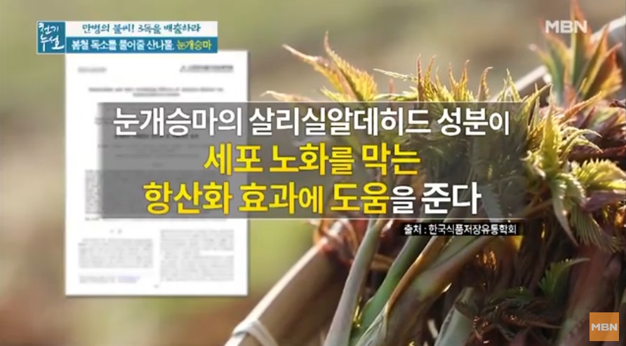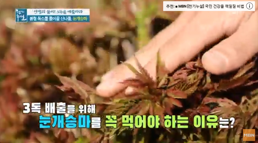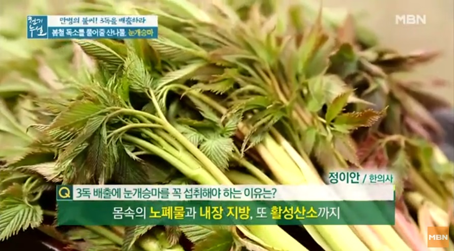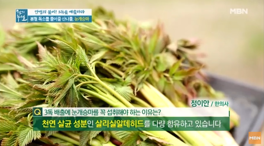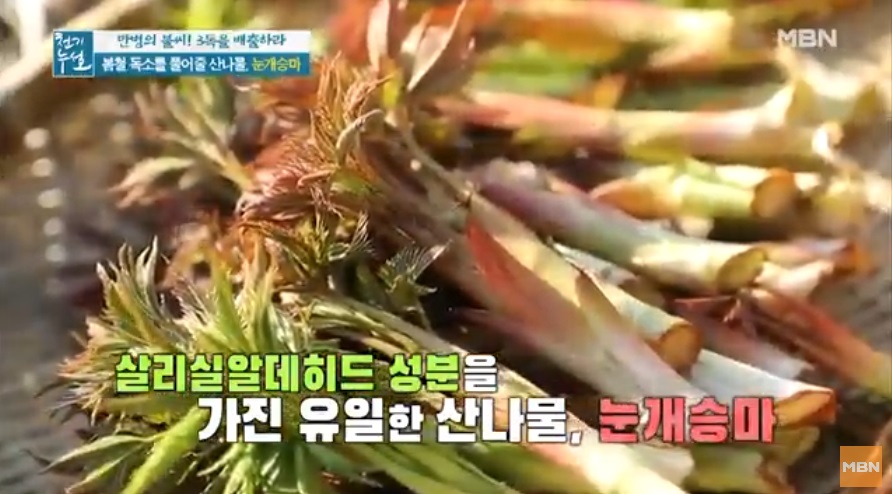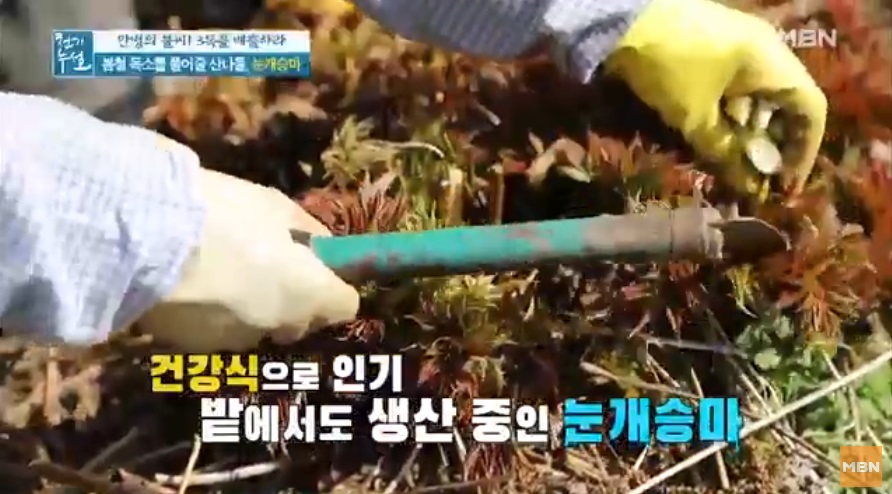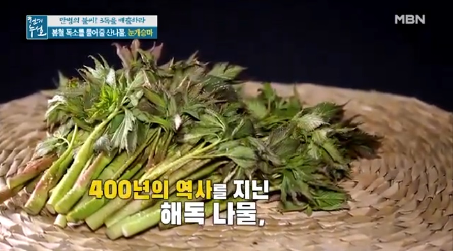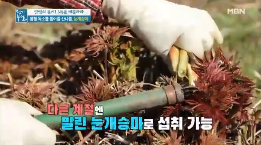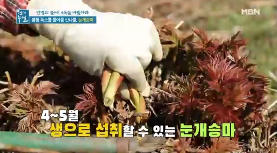 전설의 해독 약초로 불리우는 눈개승마 중국에서는 승마초로 불리운다. 인삼에 버금가는 효능을 지닌 식물이라고 알려져 있는 눈개승마는 울릉도에서는 인삼맛, 두릅맛, 고기맛 세 가지 맛이 난다고 해서 삼나물이라 불린다. 눈개승마는 전국 각처의 고산지역에서 자라는 다년생 초본으로. 생육환경은 낙엽이 많으며 반그늘 혹은 음지에서 자생하는것이 특징이다. 크기는 30~100㎝이고, 잎은 길이가 3~10㎝, 폭이 1~6㎝로 광택이 나는 긴 잎자루를 가지고 있다. 2~3회 정도 깃털과 같은 모양으로 갈라지는 깃꼴겹잎으로, 끝이 뾰족하고 가장자리에 파고드는 모양의 톱니가 있다.