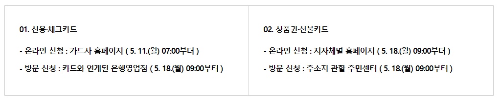 나머지 국민은 11일부터 신용·체크카드 18일부터 상품권·선불카드 선택해 신청 가능 하다.