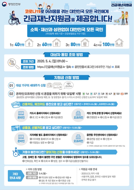 정부가 신종 코로나바이러스 감염증(코로나19) 사태에 따른 긴급재난지원금 지급을 금일 4일부터 시작한다.