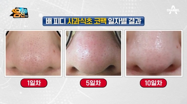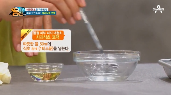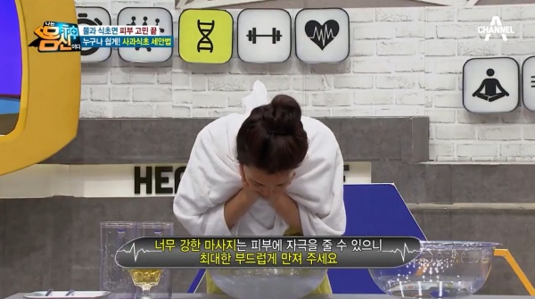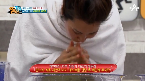 나는 몸신이다 에서 소개된 피지, 각질 잡는 세안법으로 사과식초 세안법, 사과식초코팩은 이미 많은 이들이 사용할만큼 유명하다. 특히 헐리웃 스타 스칼렛 요한슨의 세안법으로도 유명한 피부 관리법이다.