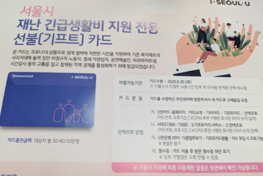 코로나19 사태로 인해 여러 지자체가 지역화폐 형태로 재난지원금을 지원하고 있으며, 서울시는 서울시 선불카드 형태로 생활비를 지급받을수 있게 새로운 지원형식을 만들었다. 지급 방법은 서울사랑상품권(제로페이)과 선불카드 중에 선택할 수 있으며. 서울사랑상품권 같은 경우엔 추가로 10%를 지급해주기도 하며, 모바일로 지급하기 때문에 더욱 편리해보이지만, 제로페이를 쓸 수 있는 곳이 생각보다 많이 없기 때문에, 주변사람들만 봐도 많은 사람들이 서울시 선불카드를 선택하는 경우가 많았다.