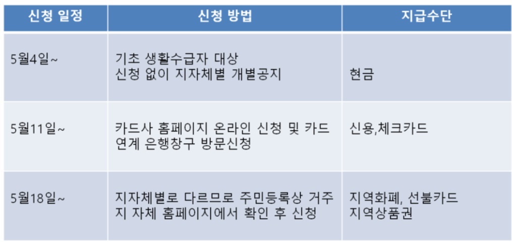 생계급여·기초연금·장애인연금 수급가구 등은 기존 복지급여를 받는 통장으로 현금 입금하도록 되어 있으며, 나머지 국민은 신용·체크카드 및 지역사랑상품권, 선불카드에서 직접 선택하여 긴급 재난지원금을 신청 및 수령할 수 있다.