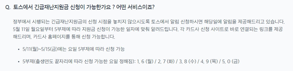 카드를 등록한 후에 토스에서 긴급 재난지원금 신청이 가능하며. 긴급 재난지원금 신청은 5월 11일 오전 7시부터 신청할 수 있다.